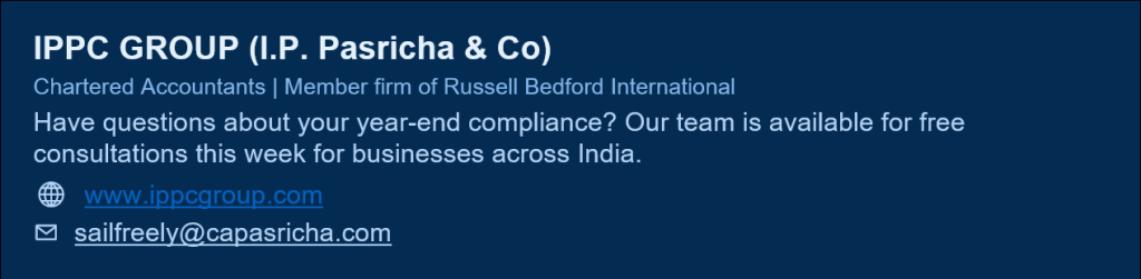 IPPC GROUP Group  |  I.P. Pasricha & Co Chartered Accountants  |  Member firm of Russell Bedford International Have questions about your year-end compliance?
